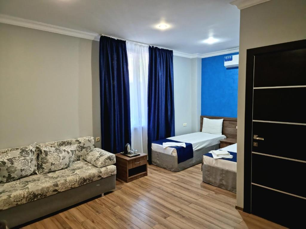 Семейная категория номера удобна для размещения гостей в количестве до 4 человек. В номере: двуспальная кровать, раскладной диван и кресло-кровать.